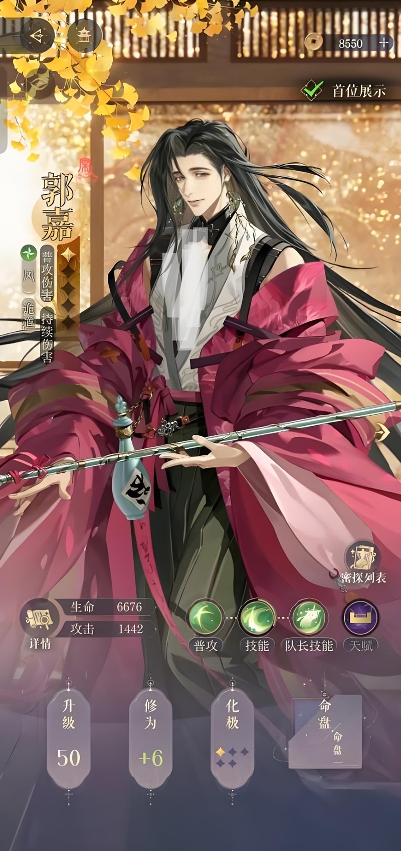 他的命盘中拥有奇袭计特性,能让队伍首次技能视为普攻,配合叠加减伤后一波爆发带走敌人。40级时郭嘉的合击伤害能达到两三千,是团队输出的核心保障。在配队时需要注意郭嘉释放大招会消耗自身血量,必须搭配治疗角色。