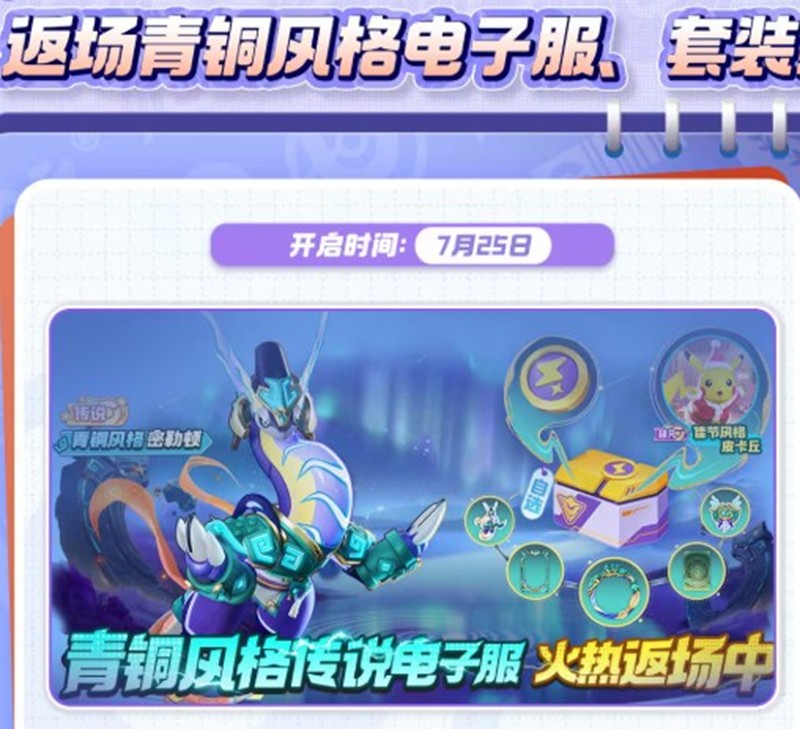 7月25日10点起,返场,传说电子服青铜风格[密勒顿],附赠佳节风格绮愿礼盒,内有超凡电子服佳节风格[皮卡丘]等你来!