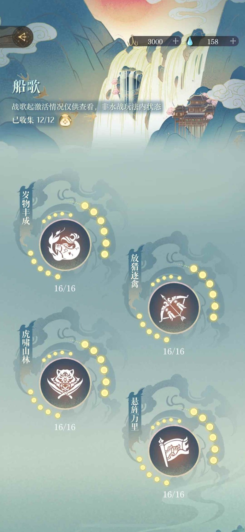 【水帘洞】我用的楼船,没有一组船歌是集齐的,最多的是悬旌万里,拿了13/14个,自认为比较重要的船歌:传幡 烈帜(与易帜在一起并不冲突)重旌 幡动 啸林 兽王 羽帜 幡庇 护旗 悬旌 饲虎(看到了直接拿就完事),虎啸和岁物的船歌都可以多拿一些。