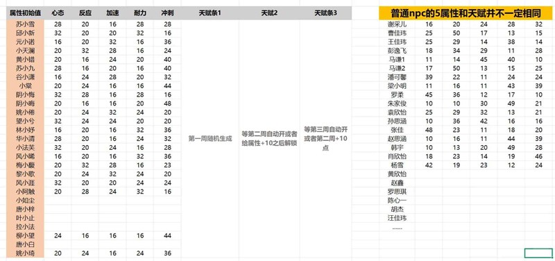 – 这次角色npc的小孩属性由于天赋随机,不一定就比普通小孩好,不是金孩子了,但各项比较稳定,普通孩子更偏科一点,缺的属性可以刷比赛自己加