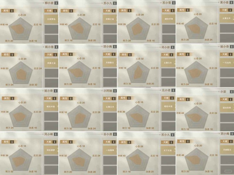 – 目前第一周每个小孩5个属性之和都是120,每个属性有所不同(50封顶),各有所长。每人每次比赛给5点加点(周上限30),随机获得别人的一条天赋。每个人属性加10点能解锁第二个天赋格子,选择随机替换第二或第三条天赋