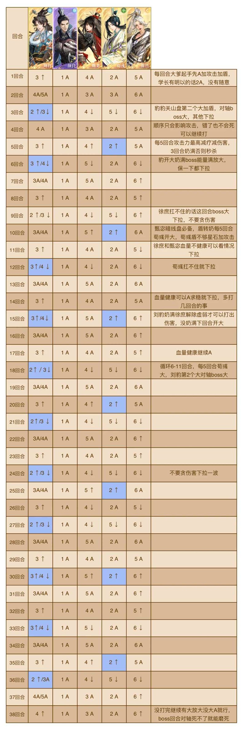 3.刘豹关山盘第二个大对轴boss大,荀彧每5回合大对轴“潜行”,其他有大大没大A,扛不住下拉,后面层数尽量boss大下拉保一下