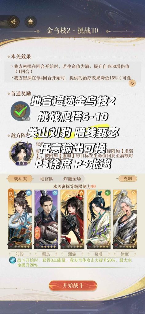 以上就是如鸢地宫遗迹挑战爬塔6-10张闿怎么打攻略的全部内容了,更多游戏资讯,攻略内容敬请关注,您的支持是我们努力的动力!