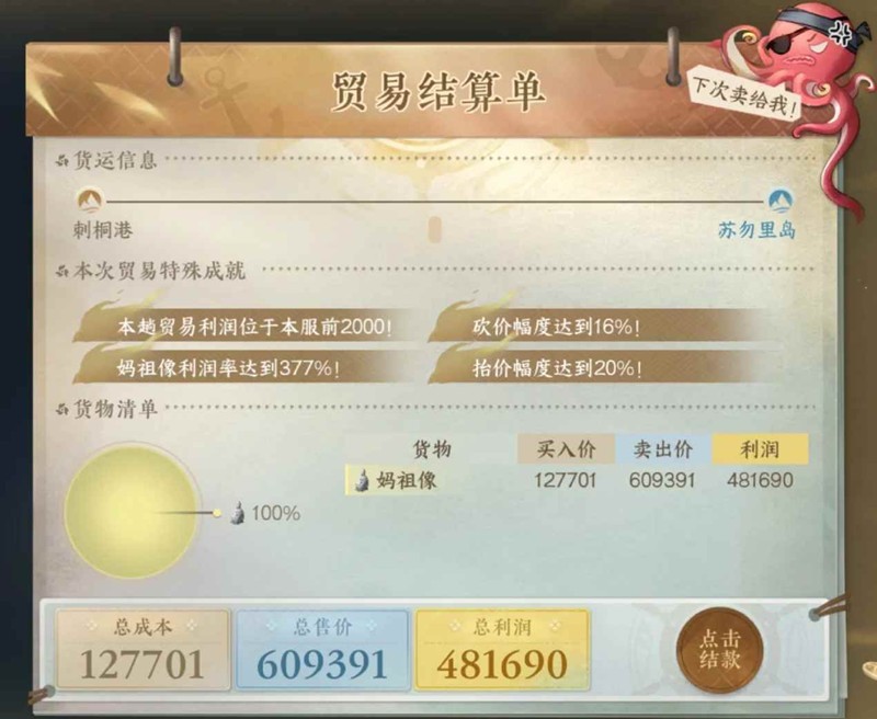 本周贸易可获得225万左右金币,海舶令的利润是随机刷新的,我这周是高级海舶令25万+100万+100万