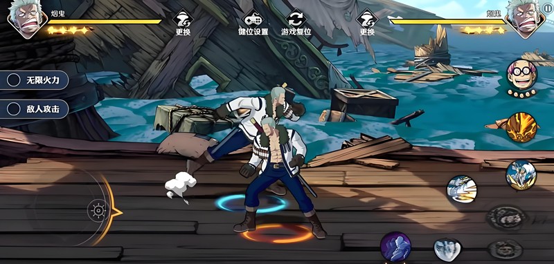鬼叔在航海王壮志雄心中拥有四个主要技能。普攻技能可以蓄力打出三段拳击,第四段能将敌人踢飞并造成七段伤害,打击感十足。一技能通过长按攻击键蓄力后能延长攻击范围,适合面对多个敌人时使用。二技能能将双手化为烟囱锁定敌人,将对手拉到面前进行连招攻击。
