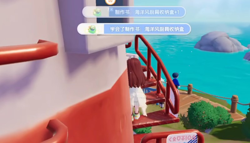 海洋风厨具收纳盒图纸在地图最南端的海边灯塔附近。这个泡泡会绕着灯塔旋转,建议玩家先走到灯塔右侧的楼梯处等待,等泡泡转过来时就能轻松获取。
