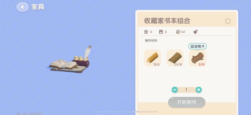 在心动小镇的家具店,老板波叔那里出售部分基础制作书,居民可以用游戏货币直接购买。获得制作书后会自动弹出学习提示,学会后就能在工作台制作对应的道具了。工作台制作界面会显示所需材料清单,包括木材、矿石等基础资源,以及一些特殊材料如无暇萤石和溜溜橡木。