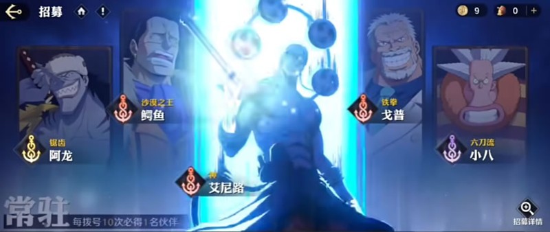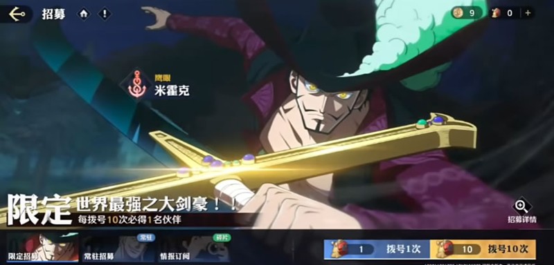 游戏中的角色获取方式分为常驻卡池和限定卡池。普通角色可以通过常驻招募获得,而像鹰眼米霍克这样的顶级强者则只能在限定卡池中抽取。限定卡池会定期轮换,给玩家更多收集强力角色的机会。