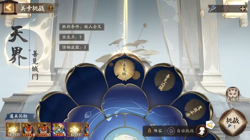 关卡挑战开启时间为7月23日至7月31日,前7日的每天0点解锁一个新的关卡。大人可通过消耗「天元扇」选择挑战关卡,在副本战斗开始前可选择本局中需要控制的式神。取得副本胜利即可获得随机御魂等掉落奖励,并结算角色任务~