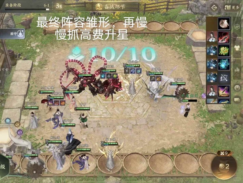 2-3升五级,此时羁绊前排已成型,右下角旗子刷到能升星的和更好的前排或输出就换,有辅阵必拿,但不需要刻意刷新