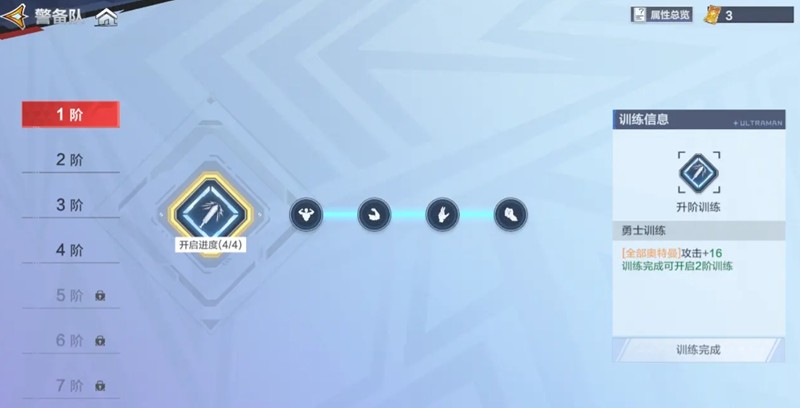 警备队系统包含勇气训练和潜能档案两个功能。勇气训练通过训练点来提升全体奥特曼属性,训练点可通过副本首通获得。潜能档案则能查看所有奥特曼形态,达成条件后可以提升档案等级。