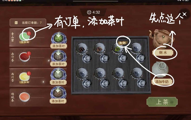 做茶先点烧水,然后根据左边订单情况添加茶叶,等茶碗中有茶叶再倒水,显示“加奶”就添加牛奶,添加牛奶要在倒水之后