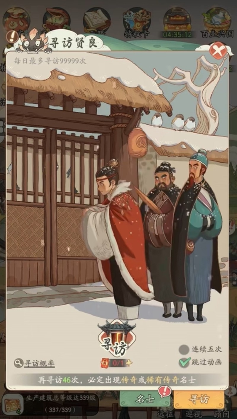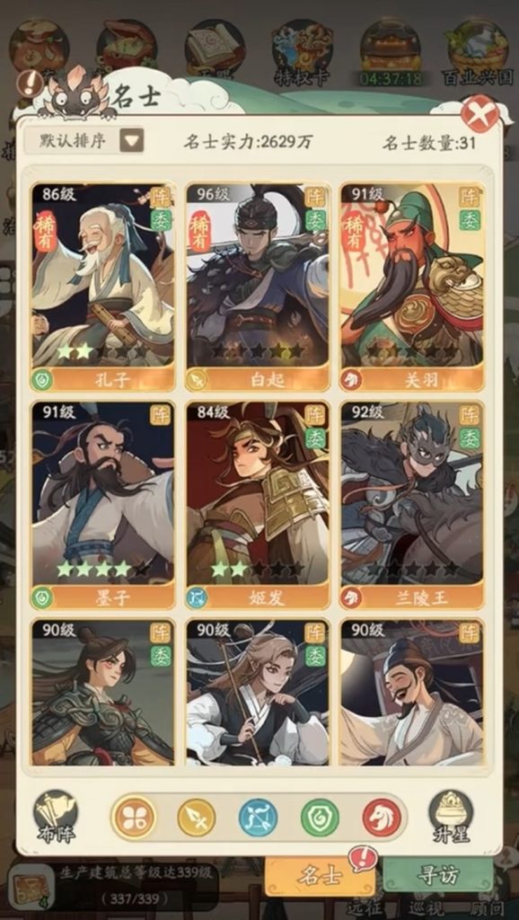 获取名士的主要方式包括活动奖励、开箱子和寻访贤良。其中寻访贤良是最稳定的获取渠道,支持单抽和五连抽,并且设有保底机制。建议优先使用寻访贤良来获取高品质名士,这样可以最大化资源利用效率。