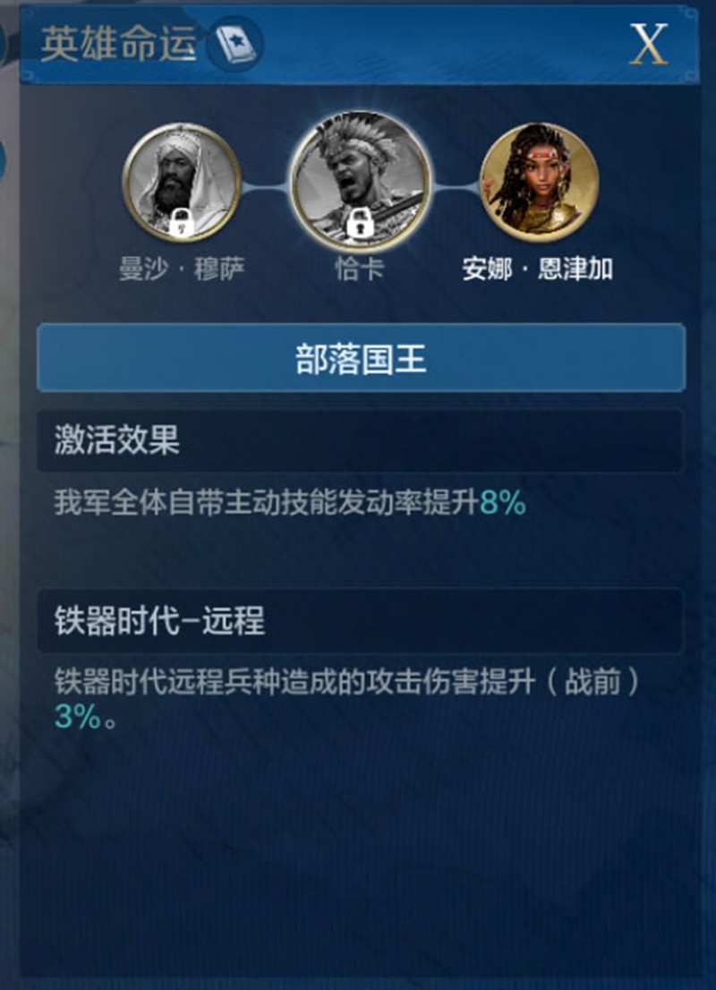 恰卡与曼沙·穆萨、安娜·恩津加组成的非洲阵营羁绊效果相当实用。这个羁绊能提升全军所有主动技能的发动几率,对于依赖主动技能输出的阵容来说是个不错的增益。建议搭配一些高威力但触发概率较低的主动技能,能最大化羁绊效果。