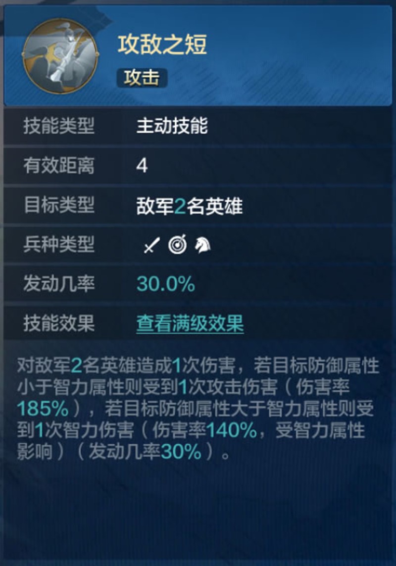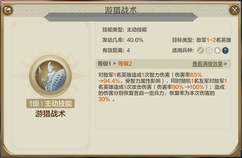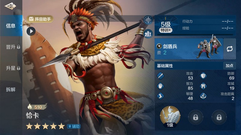 恰卡是智力型步兵英雄,攻防属性较为均衡。他的核心技能游猎战术为主动技能,效果是发动智力攻击的同时,能带动队友进行一次武力攻击。这个技能的特殊之处在于,每次攻击都能为攻击者带来小幅度的治疗效果,在持久战中能提供不错的续航能力。