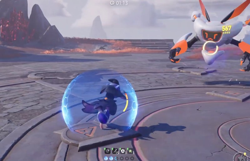 接下来要面对的是火系boss。这时最好派出毒系宠物进行对抗。boss战过程中,除了要集中火力攻击boss本体,还要优先清理它召唤的小机器人。巨型机器人的跳跃攻击会造成大范围伤害,玩家可以选择跟随跳跃或快速逃离红色区域来躲避。