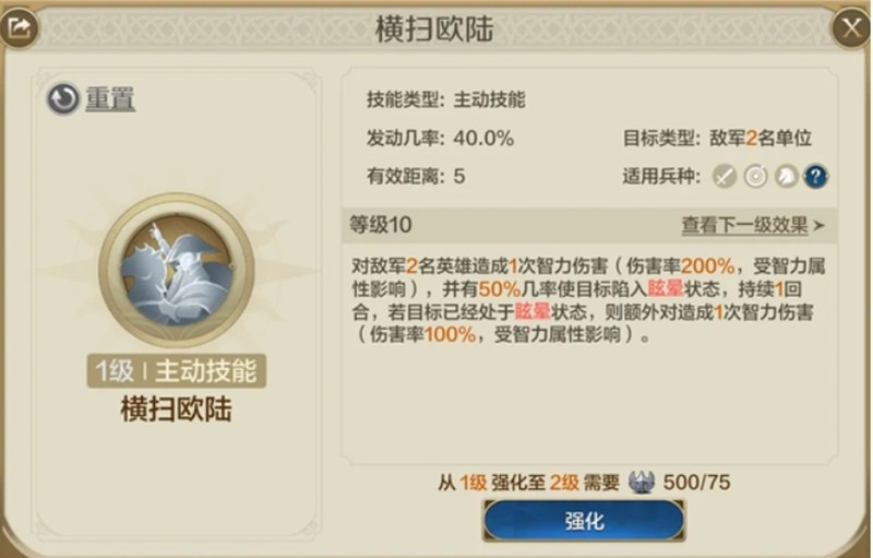 拿破仑的自带技能可以对两名敌军造成200%的智力伤害,并有50%概率使目标眩晕1回合。如果目标已经处于眩晕状态,还能追加100%的智力伤害。这个技能发动率高达40%,配合贞德等辅助英雄时,发动率可以提升至64%。专属头衔还能将眩晕概率提升20%,达到70%的恐怖控制率。