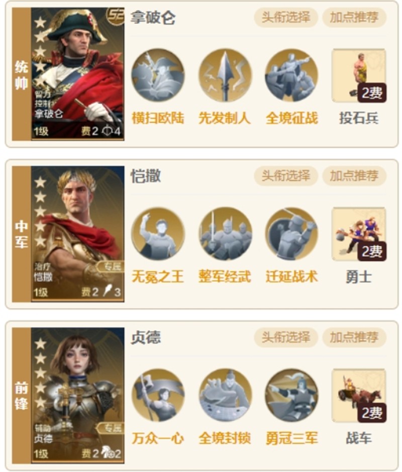 在配装方面,拿破仑可以选择攻心为上这个技能,虽然需要拆解秦始皇,但能带来更强的战术灵活性。如果不想拆解强力英雄,也可以选择奇正相生、全境征战等常规技能。由于拿破仑的技能机制与诸葛亮相似,阳焰技能也是一个不错的选择,可以组成强力的法爆快攻阵容。