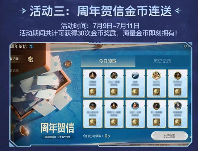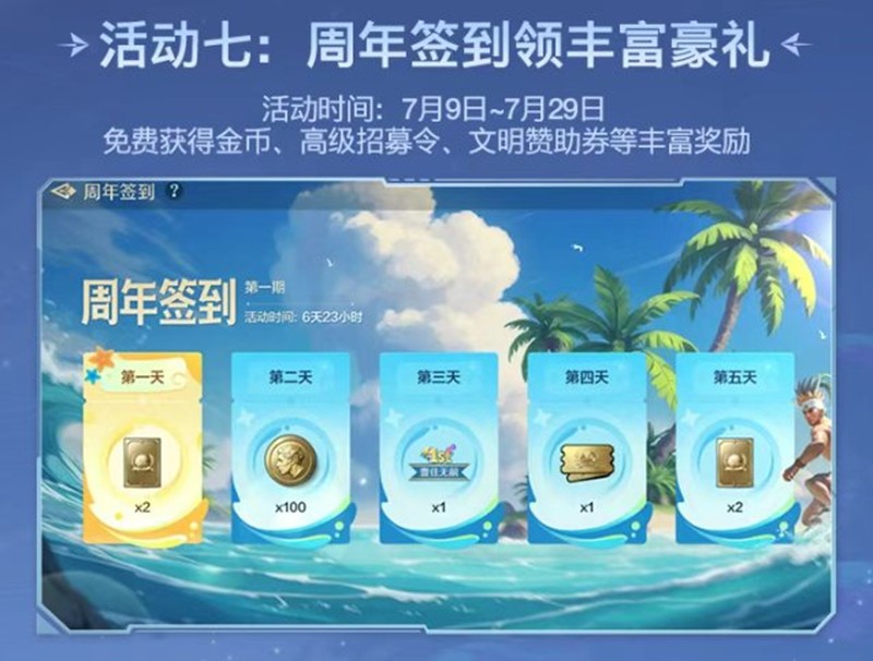 活动时间:7月9日~7月29日免费获得金币、高级招募令、文明赞助券等丰富奖励。
