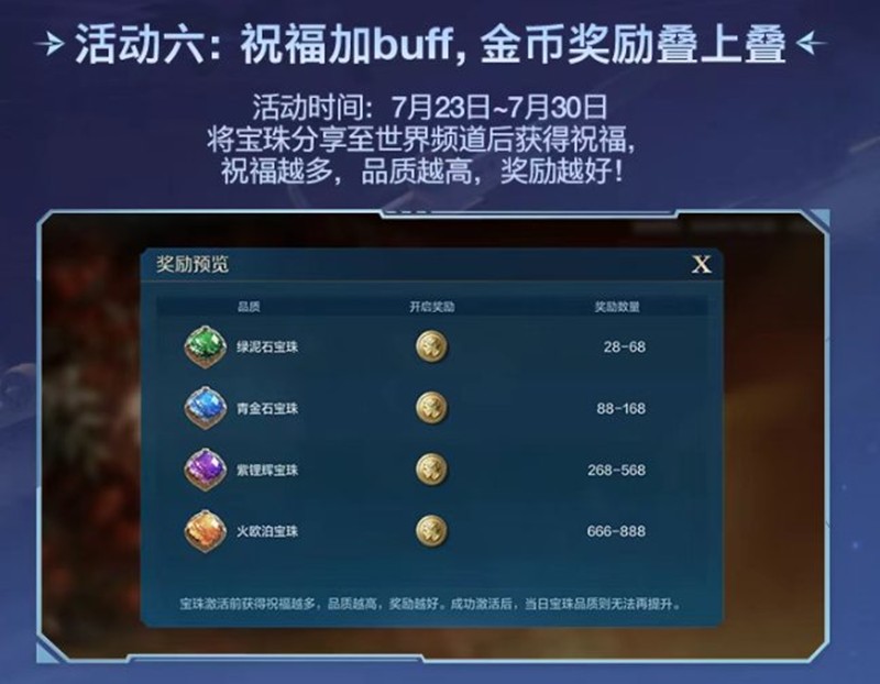 活动时间:7月23日~7月30日将宝珠分享至世界频道后获得祝福祝福越多,品质越高,奖励越好!
