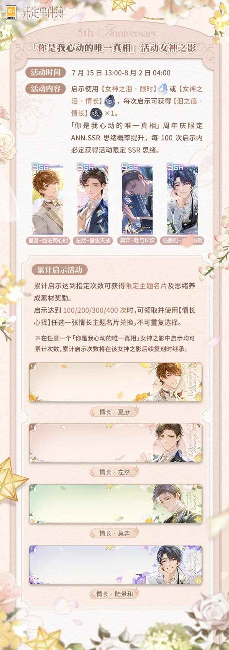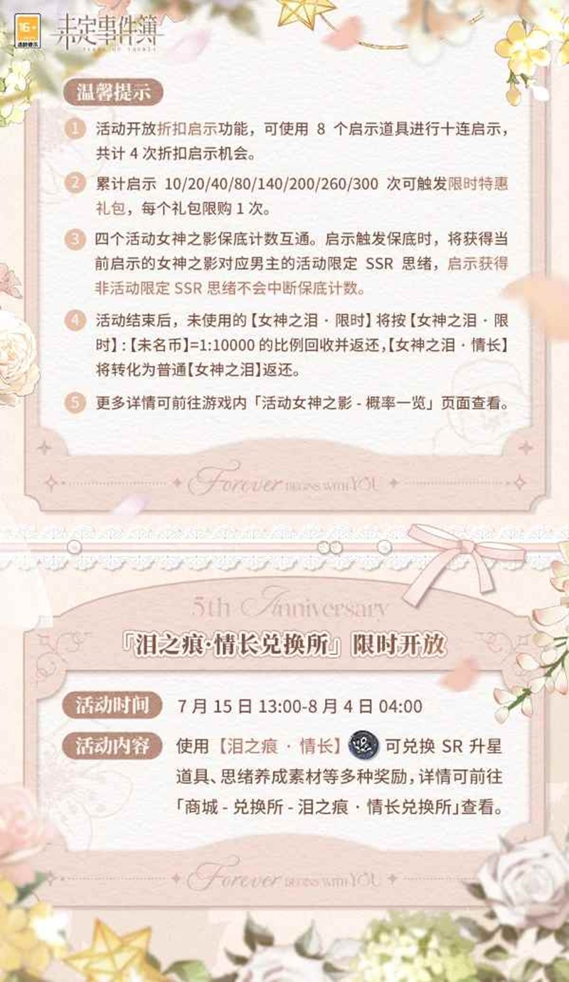 《未定事件簿》「你是我心动的唯一真相」五周年特别庆典现已结束,女神之影将于7月15日13:00开启!「你是我心动的唯一真相」活动女神之影、商城上新及更多活动即将上线,欢迎各位律师前往游戏中,体验爱与誓言的浪漫与美好!一起来和看看吧~