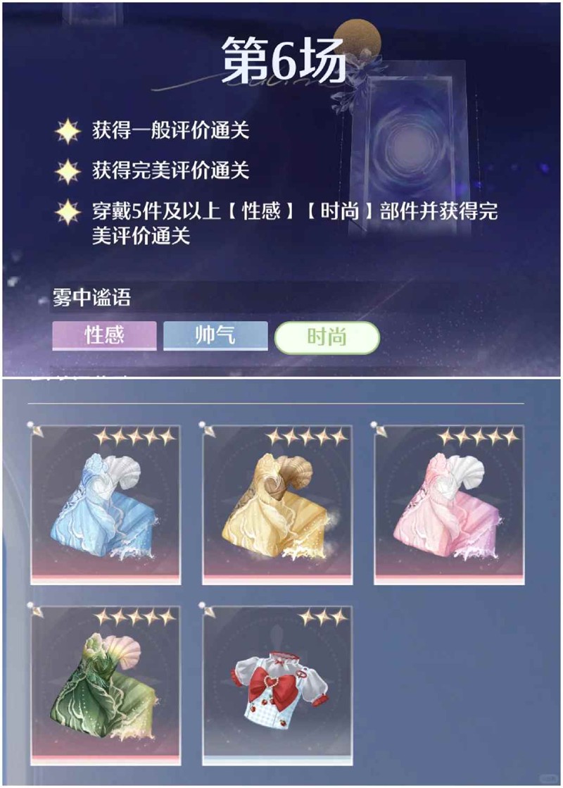 第六关:性感 时尚 五件 套装是常驻海浪套 我是直接一键穿搭(博主的海浪是二进)