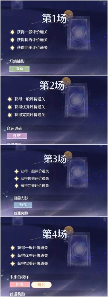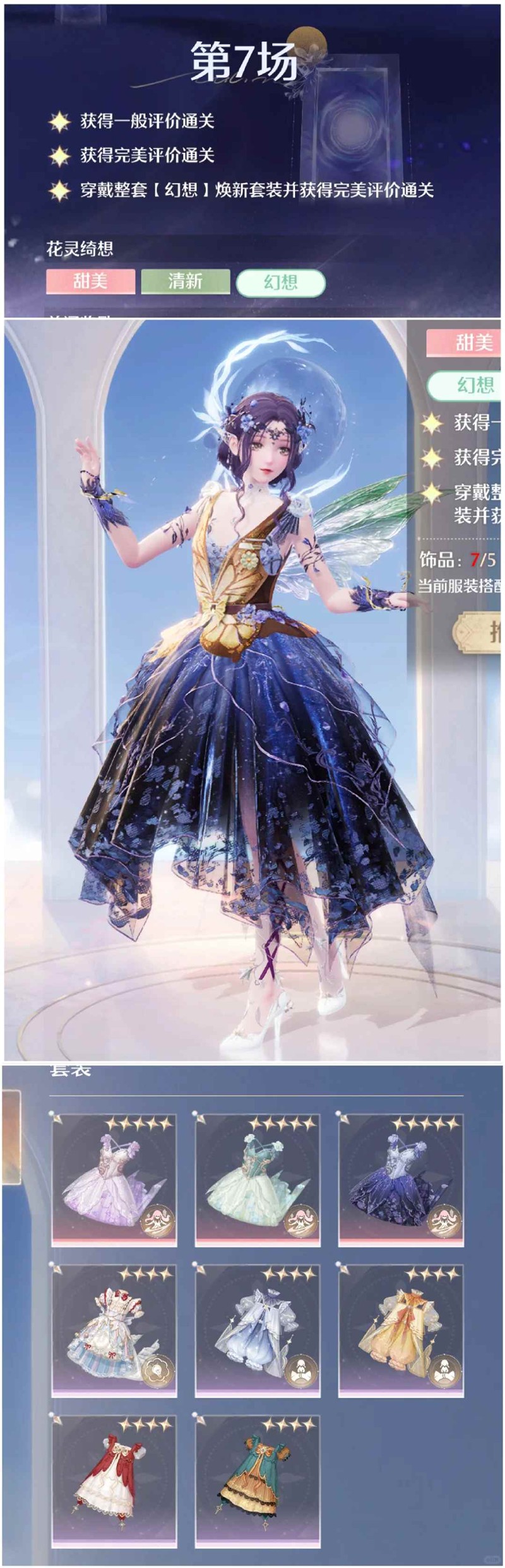 第七关:幻想标签全套焕新 我的一键默认是精灵套(本期蛇套焕新也可以用) 尝试了同样是精灵tag的星之海 只有一颗星通关,性感主属性不能用 银月莺(二进)焕新+林中戏蝶外套 一颗星 属性不够