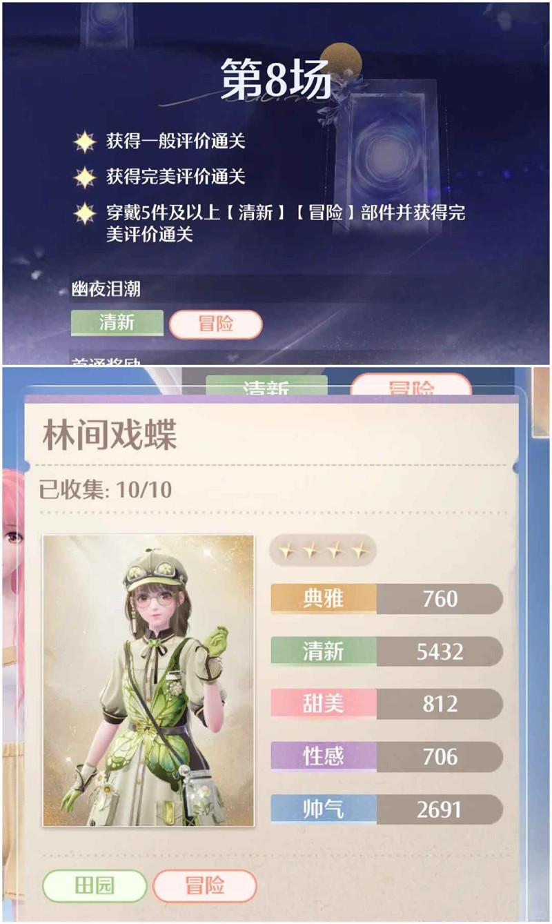 第八关:清新 冒险 五件 林间戏蝶为此属性 穿一整套焕新可完美三星通关 博主是一键气球套+五个林间部件完美通关。