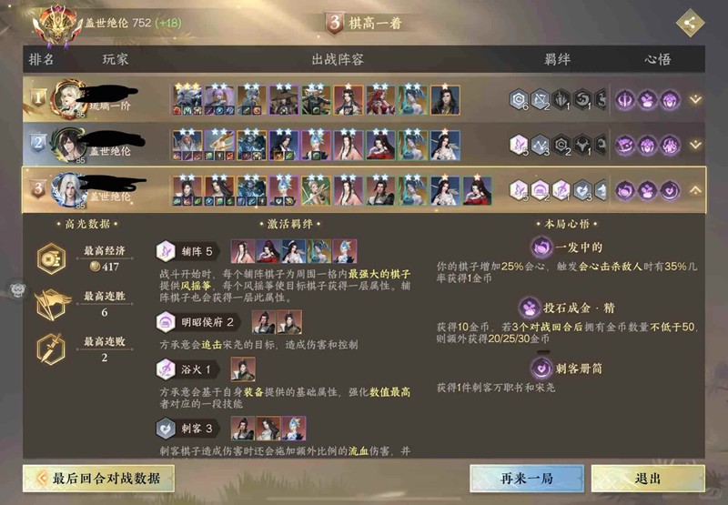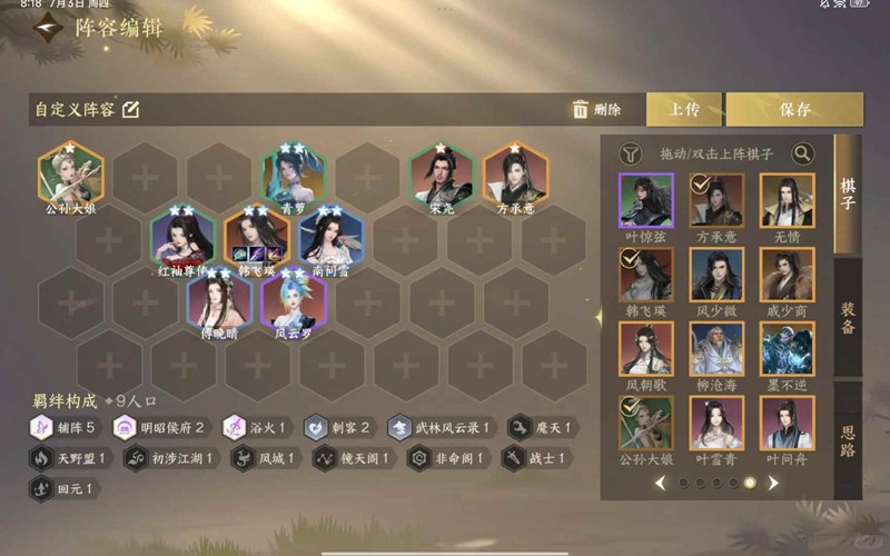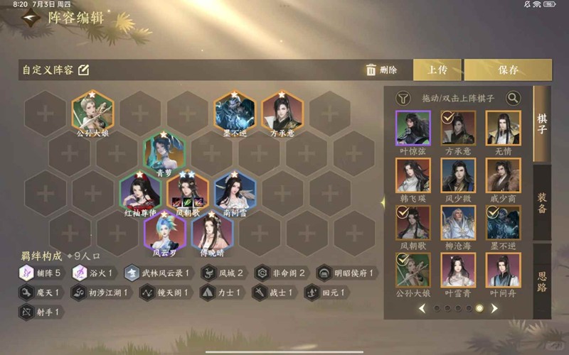 两星五费都可以用,凤朝歌、柳沧海、方承意、韩飞瑛都可以被辅阵棋子牵,其中强度是方>凤>柳>韩。但是一定要注意,五个辅助棋子务必保证全部围绕主C。(棋子对位直接保存图片)