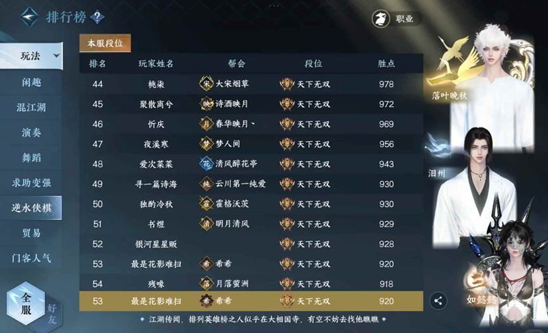 辅阵是毋庸置疑的是当前版本最毒瘤的存在,凤朝歌牵辅助和柳沧海牵辅助,大家或多或少都碰见过,详细阵容教学也可以看我昨天的帖子。但是我们依然可以把这个阵容做一些变阵,直接辅阵百搭两星橙卡,大区五十名的比赛数据参考。