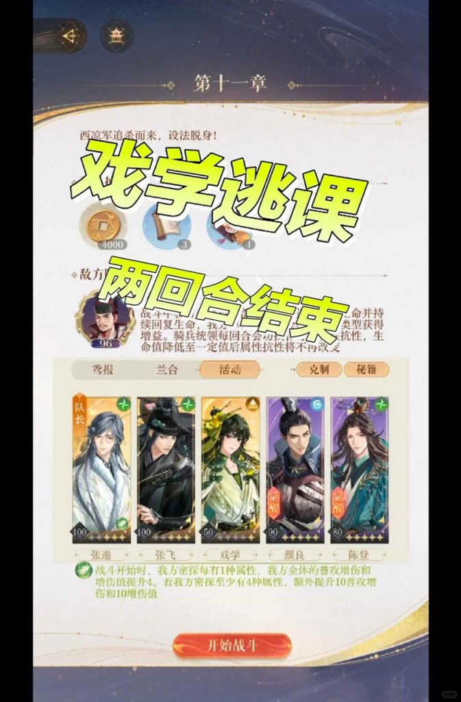 以上就是如鸢11-20骑兵统领戏学逃课两回合结束攻略的全部内容了,更多游戏资讯,攻略内容敬请关注,您的支持是我们努力的动力!