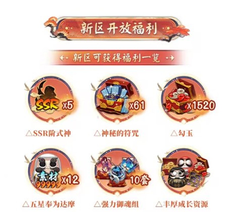 新手福利活动期间(新区开启后30日内新建角色自角色创建后的30日内)累计登录的前15日可按日获取神秘的符咒、高级觉醒材料火灵高星御魂、五星达摩、御行达摩。