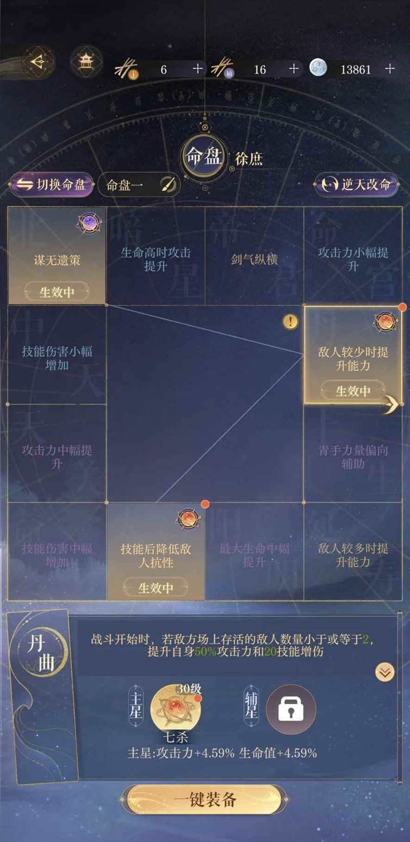 命盘在图4-8:我王粲是完美盘强烈推荐洗,实在洗不到建议优先护盾和同生共死;徐庶谋无敌少建议洗出;陈登能量+2建议洗出;颜良普回可以洗;杨修能量+建议洗出(如果只有一星杨修就不要养了,杨修可替换任意其他高攻输出)