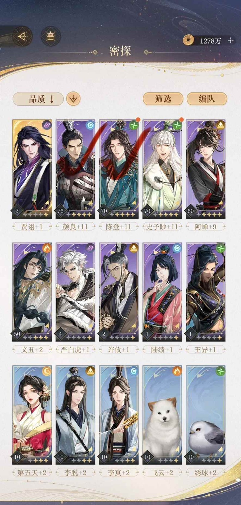 等级练度如图2,3:徐庶80.13(主c要拉80)颜良76.11(这个没80倒也还好),其余都是70.11~