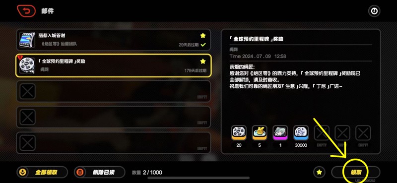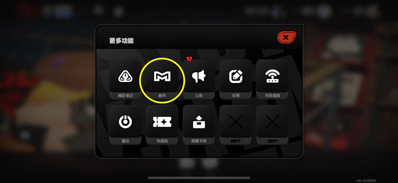 完成新手教程后,点击左上角第一个按钮进入”更多功能”界面。选择第二个”邮件”按钮,未领取的邮件会有红色标记提示。打开邮件界面后,右下角显示”领取”按钮的邮件可以直接获取奖励。