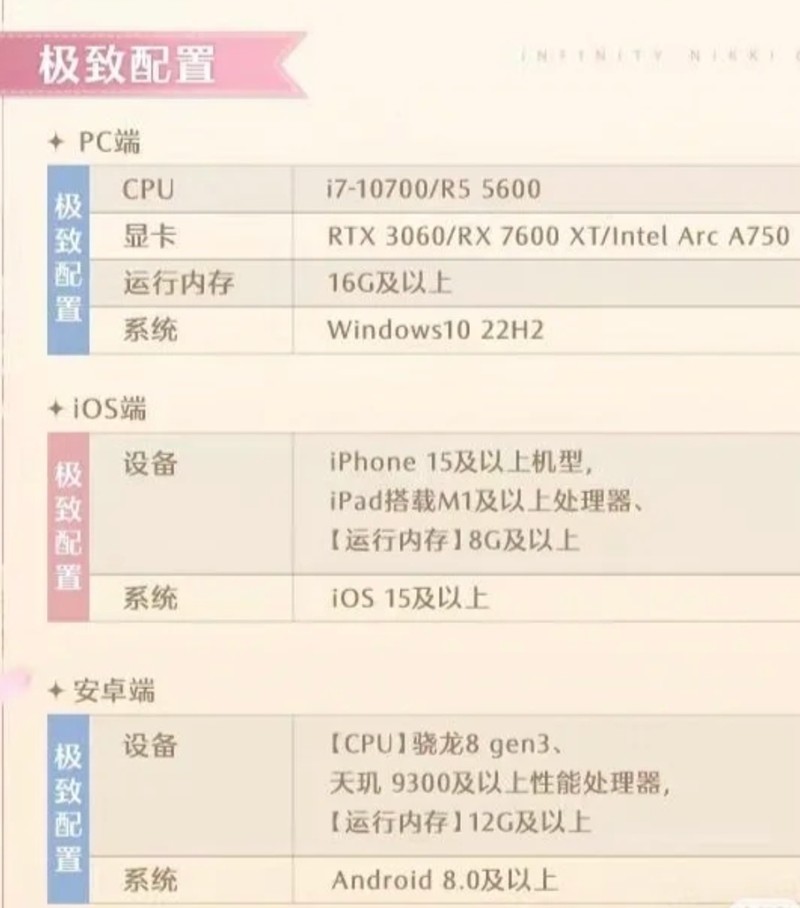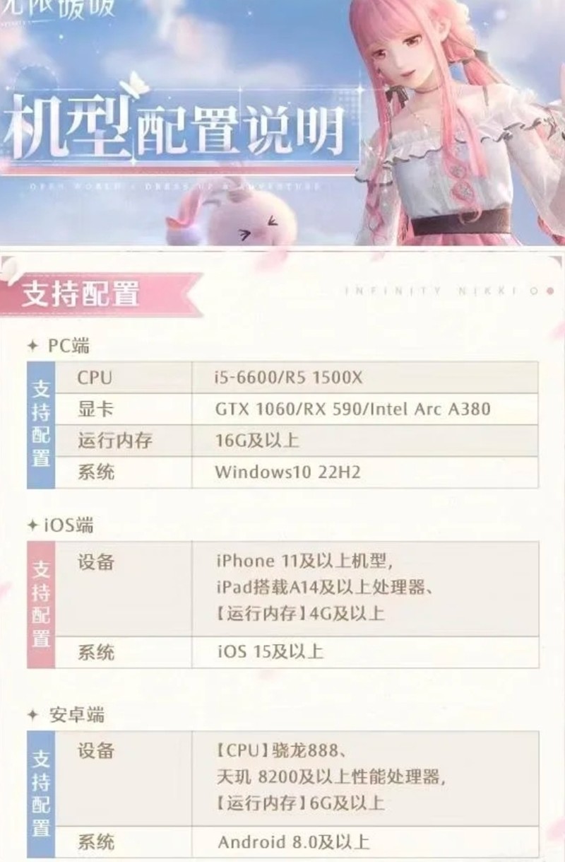 以上就是无限暖暖的配置需求介绍了。想要畅玩这款精美换装手游,建议玩家们根据自身设备情况选择合适的运行平台。