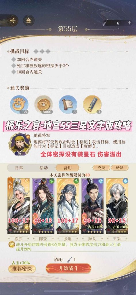 以上就是如鸢地宫55怎么打,极乐之宴地宫55三星文字版攻略的全部内容了,更多游戏资讯,攻略内容敬请关注,您的支持是我们努力的动力!