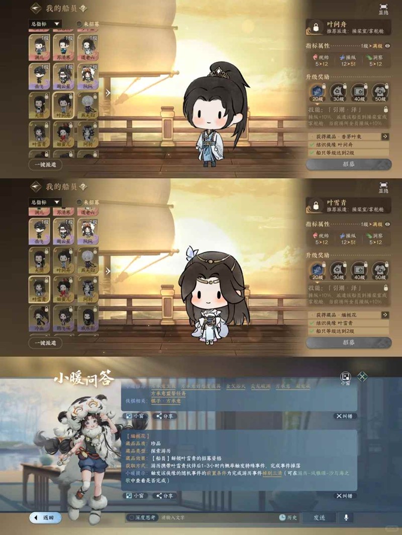 2.叶问舟/叶雪青:船只2级,游历携带1-3小时内触发特殊事件,完成概率掉落