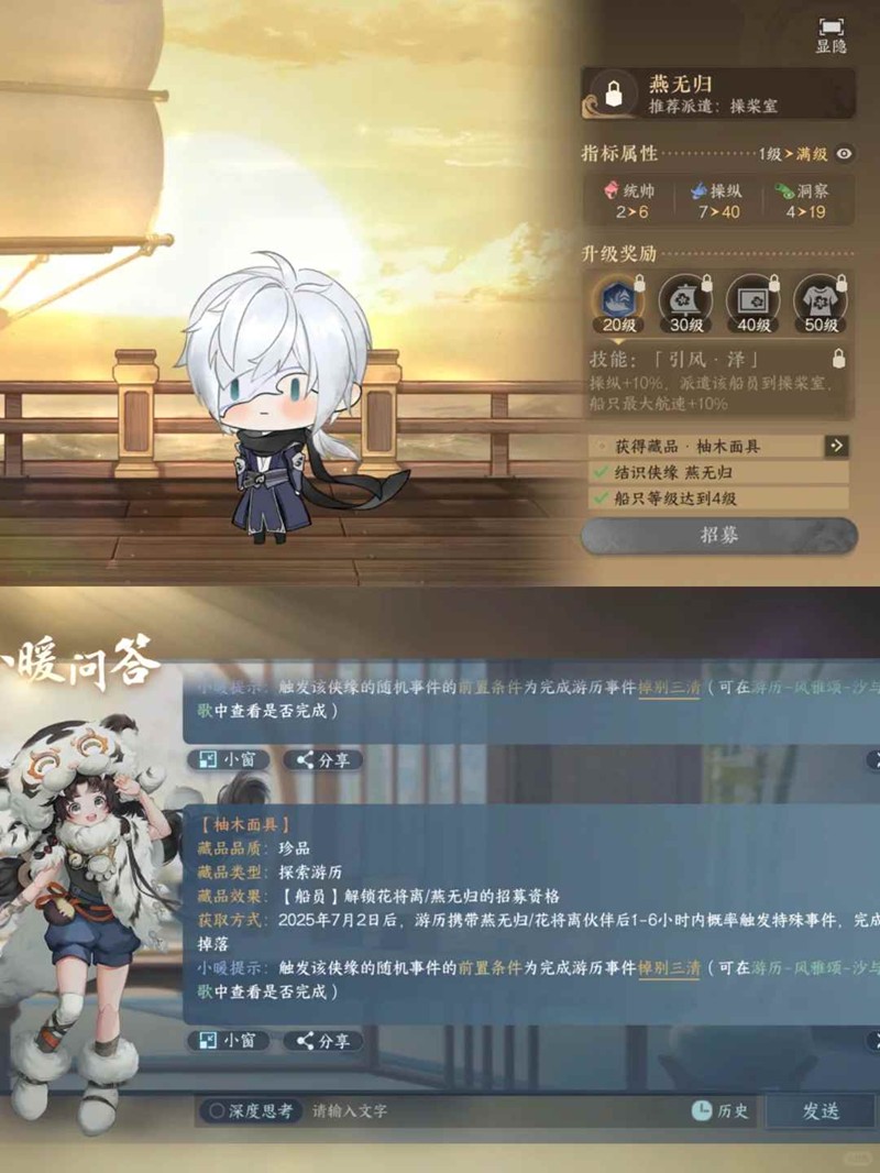 4.燕无归:船只4级,游历携带1-6小时内触发特殊事件,完成概率掉落
