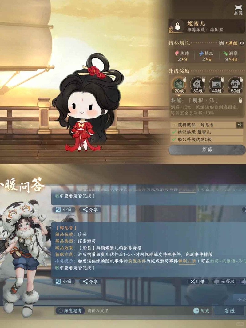5.姬蜜儿:船只5级,游历携带1-3小时内触发特殊事件,完成概率掉落