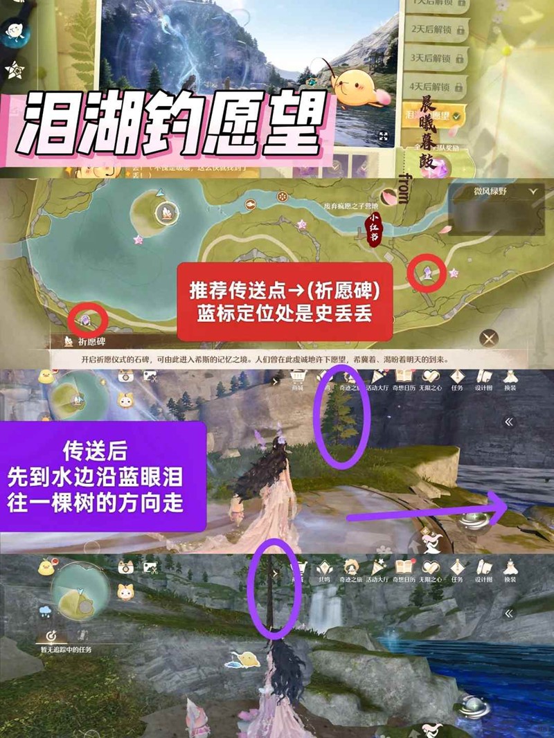 传送点(祈愿碑)→找单独一颗树的方向→跳到水边往树的方向走→视角中心树和瀑布差不多挨着→看见史丢丢调查