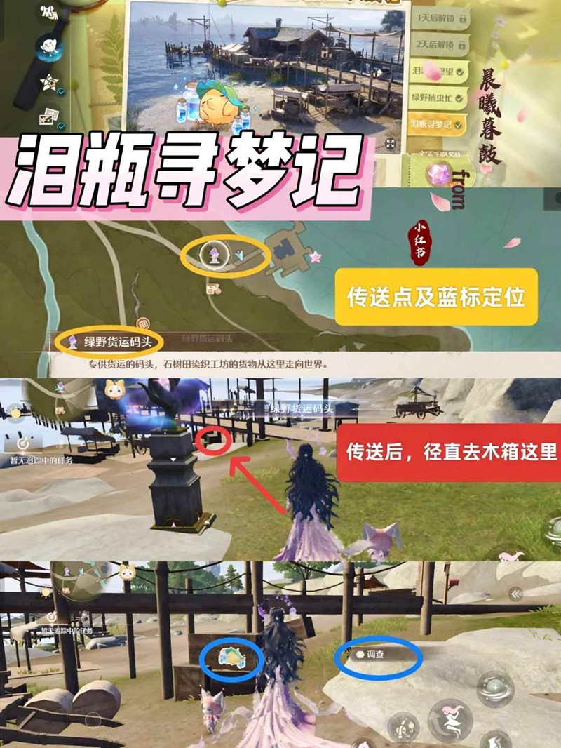 传送点(绿野货运码头)→传送后不动视角,朝图上红圈小箱子径直走去→史丢丢就在箱子上