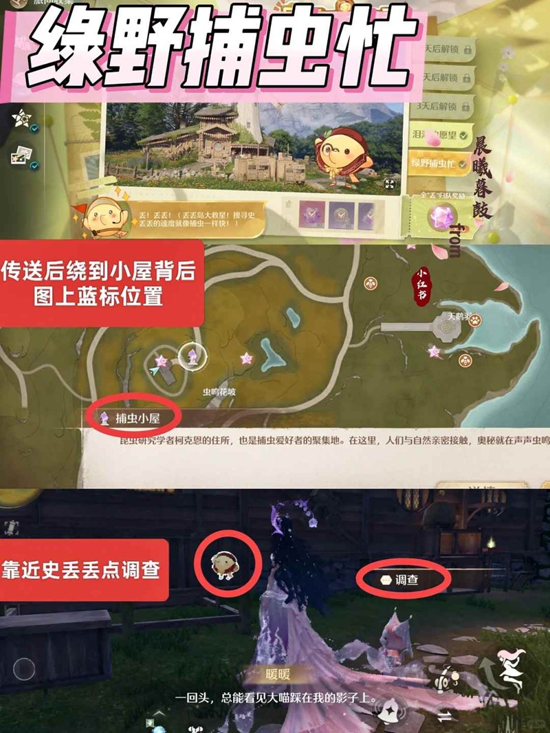 传送点(捕虫小屋)→绕到小屋背后→靠近史丢丢点调查