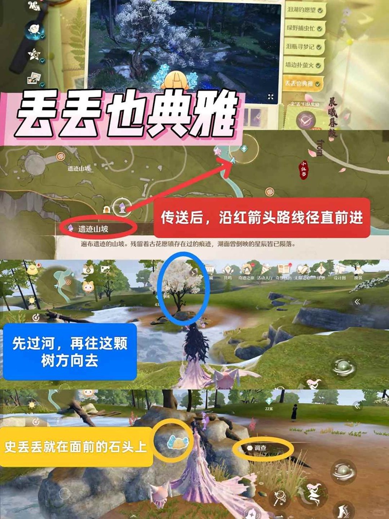 传送点(遗迹山坡)→传送后视角转到背后沿图上红箭头方向径直跑→过河→直接就能看见树下石头上的史丢丢
