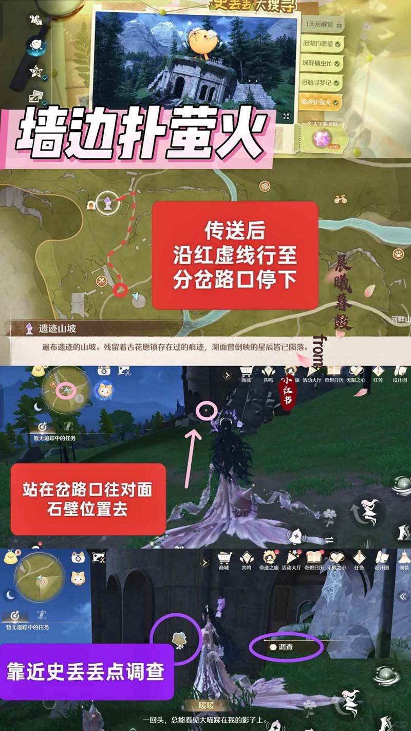传送点(遗迹山坡)→沿图上红虚线行至分岔路口停下→往图上所示对面石壁方向去→靠近史丢丢调查