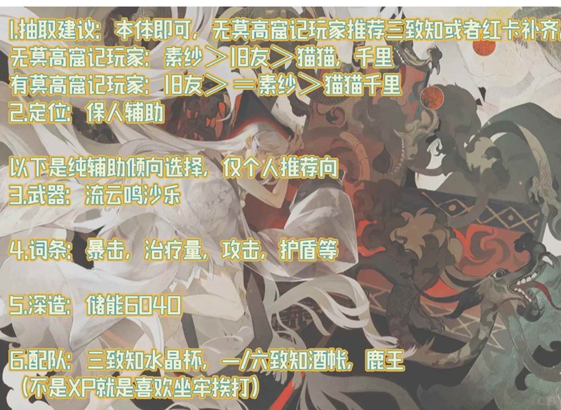 武器:熊猫竹灯、流云鸣沙乐。词条:暴击率、暴击伤害、构素伤害提,升、伤害提升。深造:威慑7300