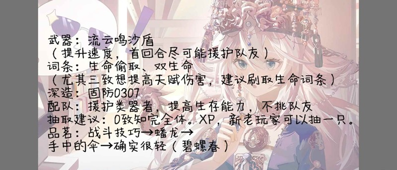 武器:金桂抱月灯、流云鸣沙乐。词条:暴击率、护盾增益、治疗量提升。深造:威慑5500,储能6040
