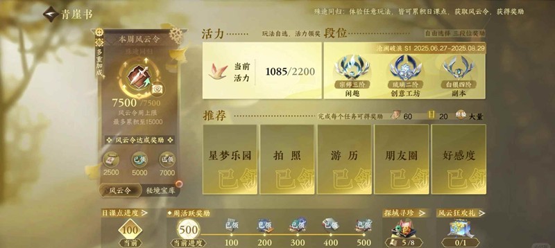 琳琅商店/盈玉商店/帮会商店,按需兑换,补领商店大家记得每周补领!,缉盗(pvp玩家可以搞一下,我好久没做了),差点忘了每周帮战,还能分铜!
