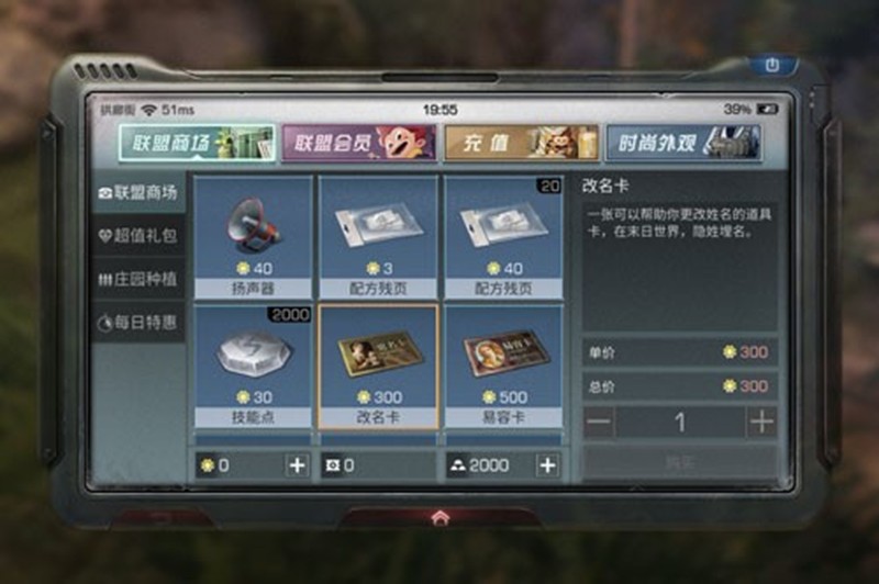 在明日之后中,改名需要使用特殊的道具”改名卡”。这个道具可以在游戏商城中购买,具体位置是主界面右上角的拱廊街-联盟商场。每张改名卡售价为300信用点,相当于30元人民币。购买后打开背包找到改名卡,点击使用即可输入新的角色名称。