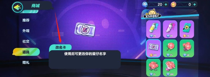 想要修改角色昵称,首先需要准备一张改名卡道具。改名卡可以在游戏商城中直接购买,售价为180蛋币。按照游戏内货币换算,相当于需要花费18元人民币才能获得一次改名机会。这个价格对于普通玩家来说确实不算便宜。